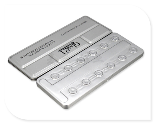 這款12色眼影彩妝鐵盒,是常規(guī)的化妝工具包裝產(chǎn)品,鐵盒風(fēng)格參照了KR彩妝鐵盒進(jìn)行設(shè)計。鐵盒依舊為鐵線翻蓋鉸位,蓋面與底部都有激凸工藝處理,而蓋面為提升效果的矩形平雕工藝,而底部為適合十二色規(guī)格的彩妝盤雕刻,而彩妝盤雕刻可根據(jù)客戶的需求進(jìn)行制作八色、二十四色等。