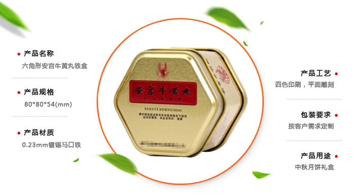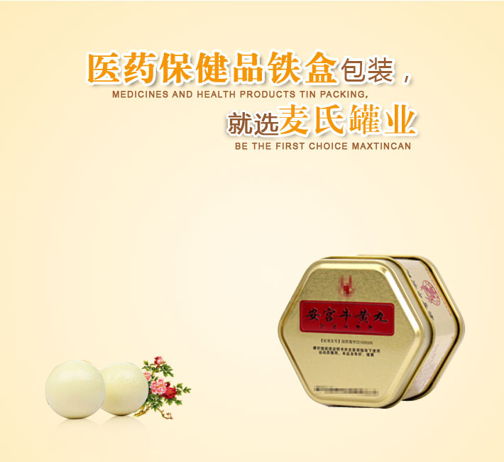六角形安宮牛黃丸鐵盒,是用來包裝存放安宮牛黃丸的一種金屬包裝鐵盒,印刷美觀,適宜保存,批發(fā)價格低,麥?zhǔn)瞎迾I(yè)可定制各種尺寸相關(guān)六角形安宮牛黃丸鐵盒,是牛黃丸包裝盒生產(chǎn)加工廠家。