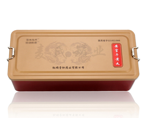 這款牛黃丸馬口鐵包裝盒,為純金色彩印刷,單面四色膠印處理,鐵罐整體全過光油,內部過金油,為鐵罐外觀增添強烈的光澤質感,對消費者產生一種耀眼奪目的視覺效果。內塞蓋的設計,為鐵罐原有的密封性能得以提升,為消費者帶來原有的醫藥風格。47*50mm的規格尺寸,可為您包裝1粒的牛黃丸產品,大容量滿足您的包裝需求。