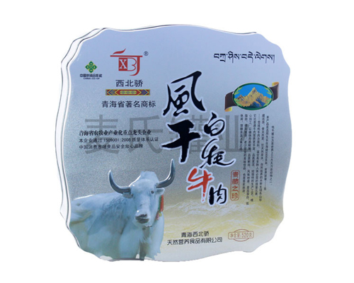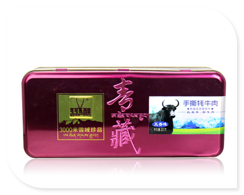 產品名稱:青海牦牛牛肉干鐵盒包裝,開窗食品鐵盒,鐵盒生產廠家