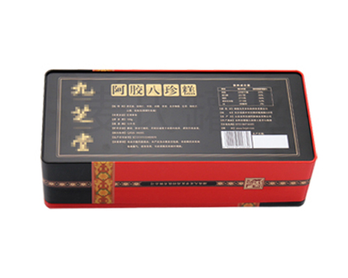 好的產品再配上好的包裝,能夠讓消費者產生沖動的購買欲望,此款180g裝阿膠八珍糕禮盒鐵罐子,長方形造型,由蓋、內蓋、身、底四個部分組成,內過光油,外過啞油、顏色鮮艷明亮,無色差,客戶還可根據您的產品需求選擇過透明油、爆炸油、皺紋油等其他油墨,多方面滿足您的包裝需求。